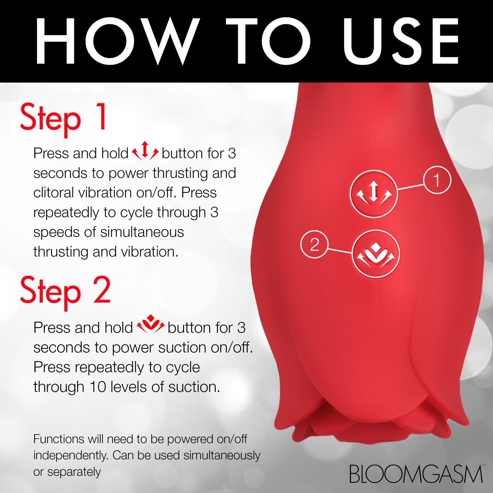 • The Full Package Rose: This rose has everything! With dual motors, it gives you a budding rose that sucks your clit, an auto-thrusting, ribbed shaft, and buzzing rabbit ears to stimulate your clit while the shaft is inserted! Features can be used simultaneously or separate.