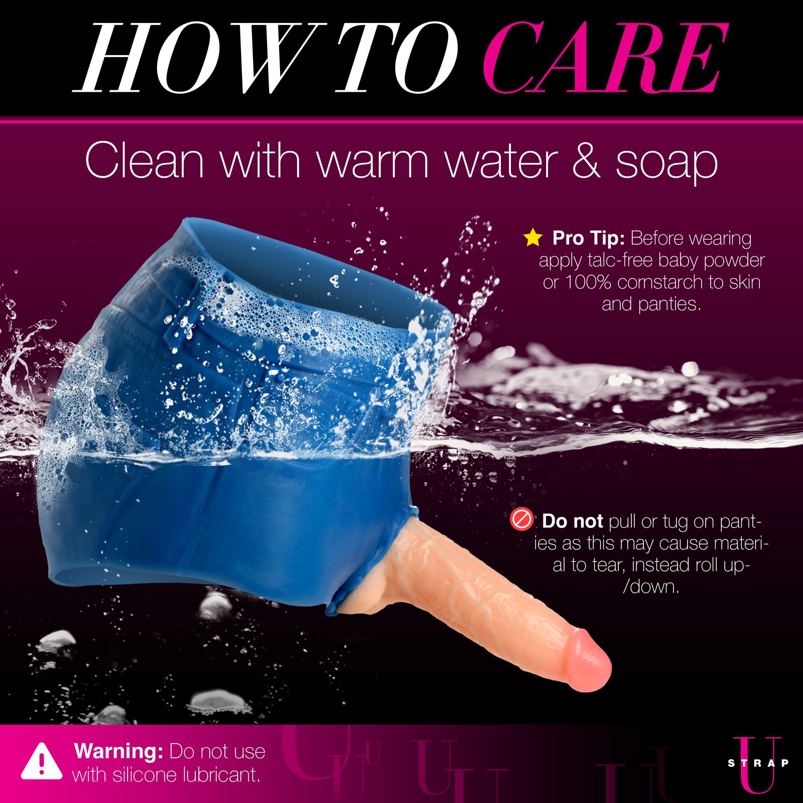 Apply talc-free baby powder or 100% cornstarch to skin and silicone shorts before wearing. Do not pull on the silicone as this may cause the material to tear. Instead, roll the silicone up/down over your skin when putting them on or taking them off. Wash with warm water and mild soap after each use. Air dry and store in a cool, dry location, away from direct sunlight and separated from other toys.