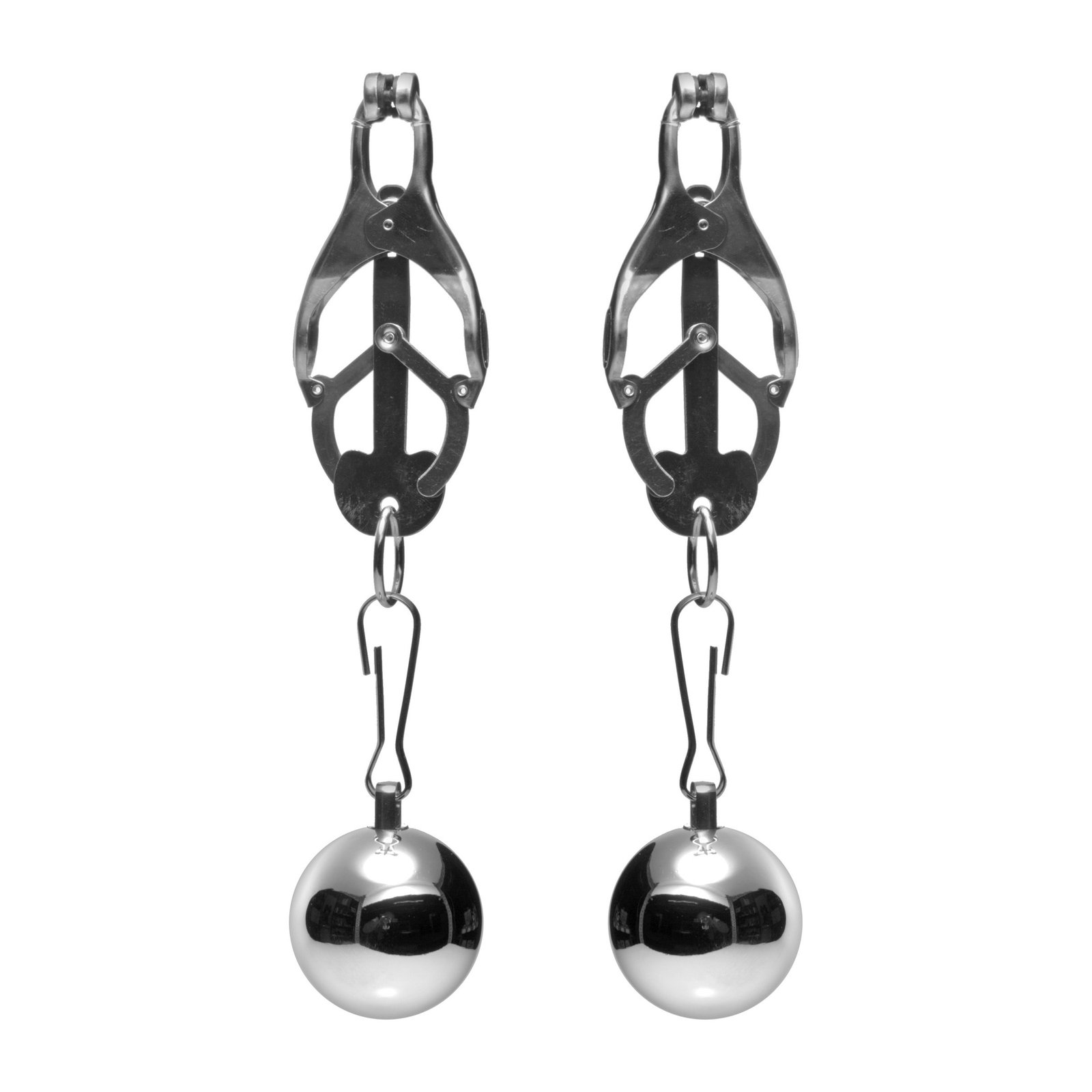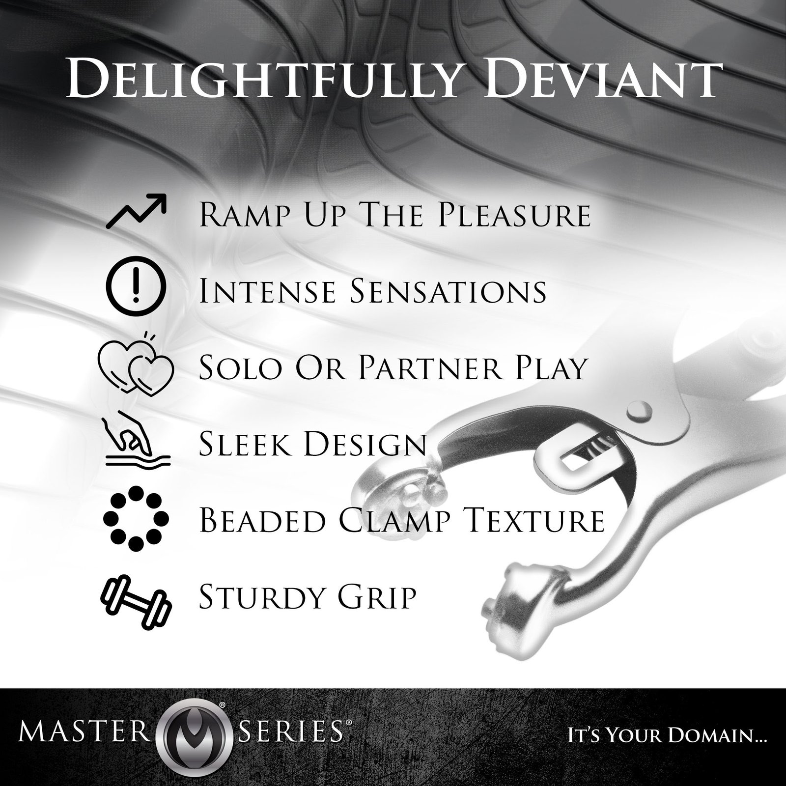These ingenious clamps are specially designed to tighten their grip as they are pulled downward. The ends are tipped with ribbed rubber, to help retain their grip and add to the sensation. Each weight clips easily on to the end, supplying 8 oz of pull each, for a full pound of pressure total.