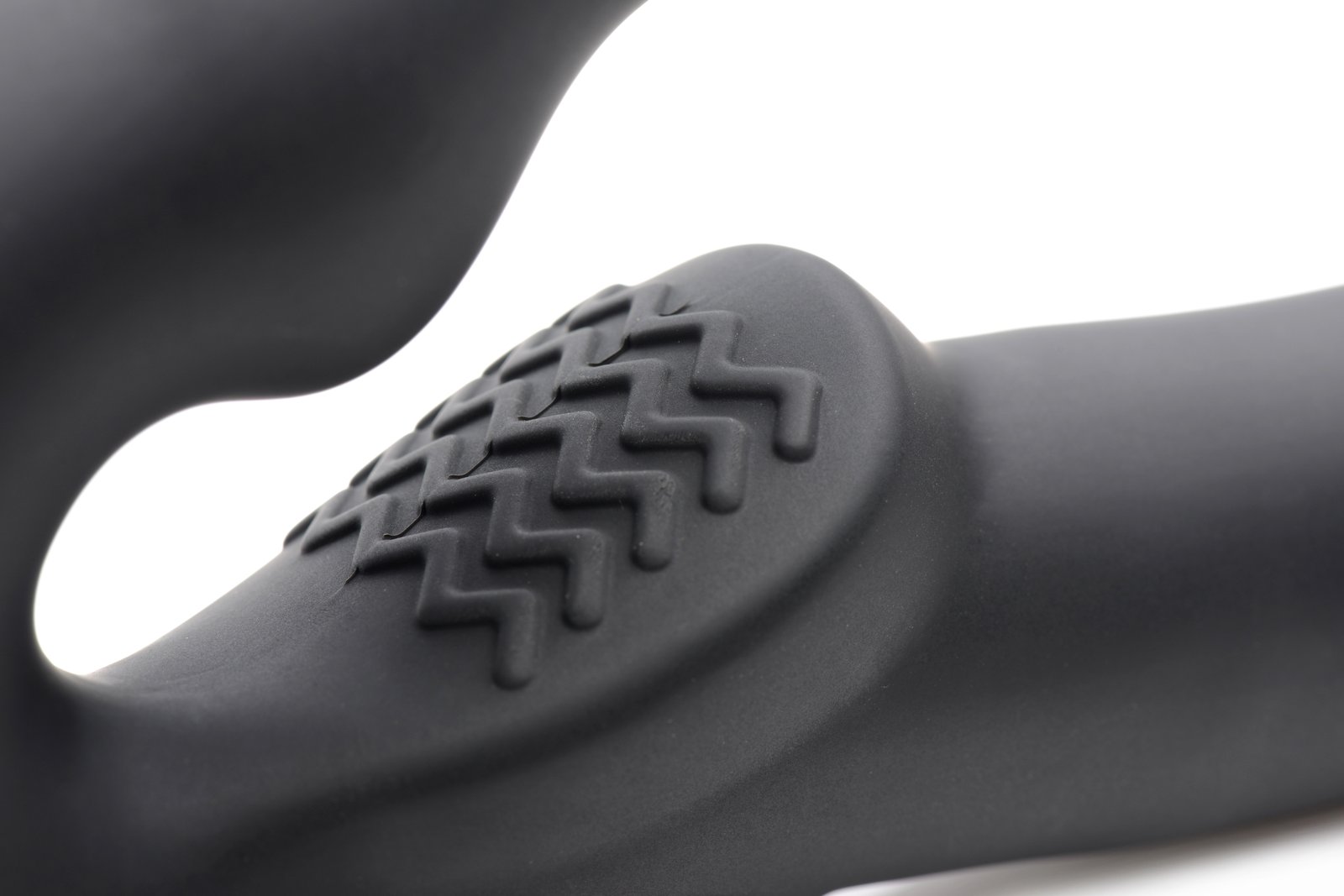 Ensure the satisfaction of both you and your lover with an elegant strapless strap-on that vibrates! This rechargeable pleasure tool features dual motors with independent control so that you can each take your pick of the 3 speeds and 5 functions of powerful internal thrumming. Both ends of this artfully designed double dildo are shaped for the ultimate in ecstasy: the bulb curves towards your G-spot to pinpoint pressure while you grind your clit against bold grooves. Meanwhile your partner will be treated to a smooth shaft with a protruding mushroom tip. It is even waterproof so that you can take your play into the shower, bath, pool, and more! Explore greater intimacy with a vibrating double-ended strapon dildo. Made of silky silicone, the Evoke is non-porous and phthalate-free. Clean with mild soap and warm water and avoid use with silicone lubricants.