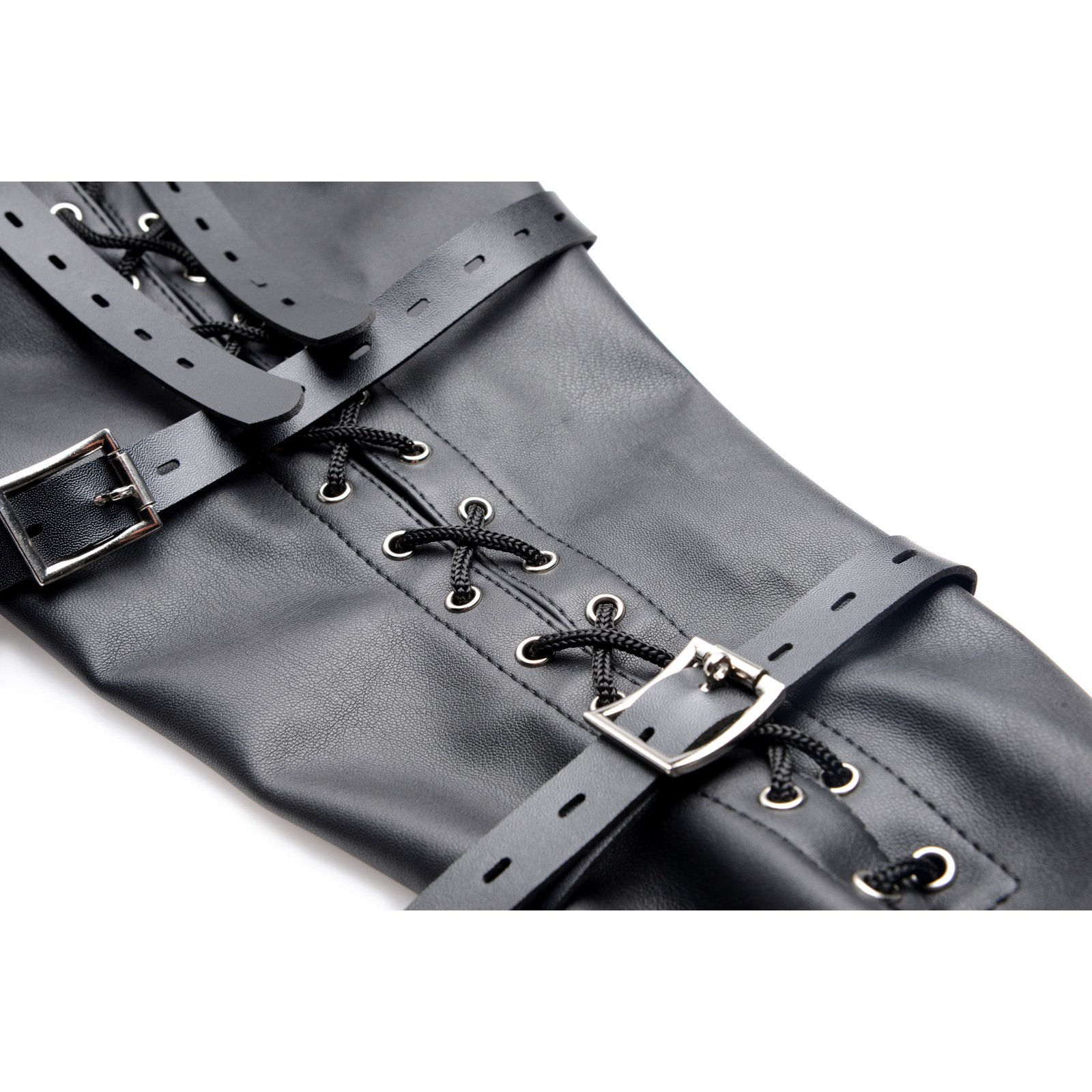 Pinch your partners arms together behind their back to fully restrain them for your amusement! This full sleeve is a unique piece of bondage gear that effectively takes your scene to the next level. Slip your playthings arms into the sleek, attractive sleeve, secure the laces, and adjust all four of the straps to a tightness that will keep them trapped, but comfortable… if that is your desire! Locking buckles allow you to further their plight and ensure that there is no hope for escape. A D-ring at the bottom even allows you to get creative with other BDSM attachments. Have your way with that vulnerable body while they squirm in pain and pleasure!