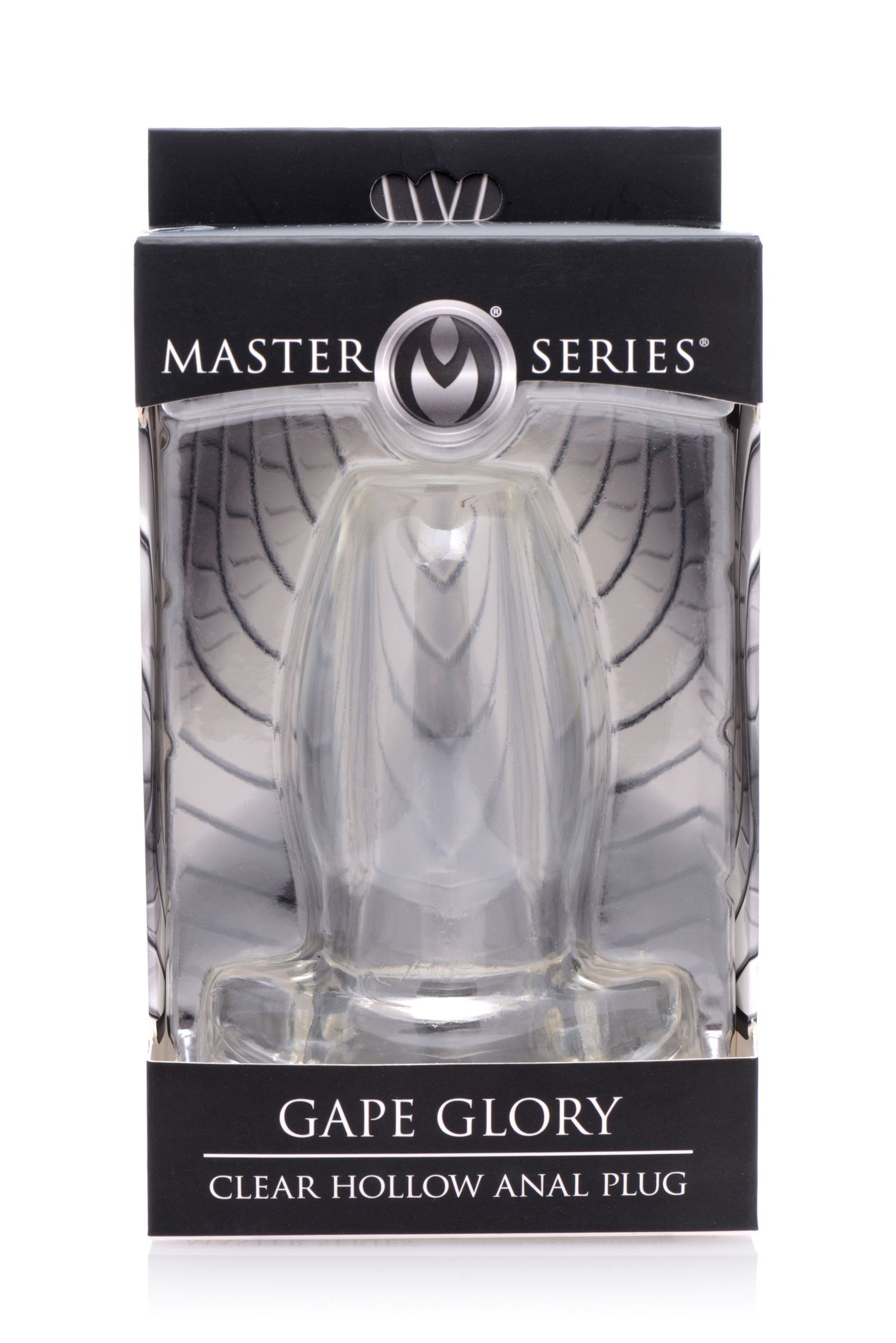 Open wide and let you partner peek inside with this large, unique anal toy. The Gape Glory allows you to discover a whole new part of your partner as you peer into the depths of their ass! This anal plug is clear and hollow for maximum visibility. The opening is also great for liquid play, whether you are delivering an enema or getting creative in other ways. A contoured base makes this plug comfortable for extended wear. This material is compatible with both silicone and water-based lubricants.