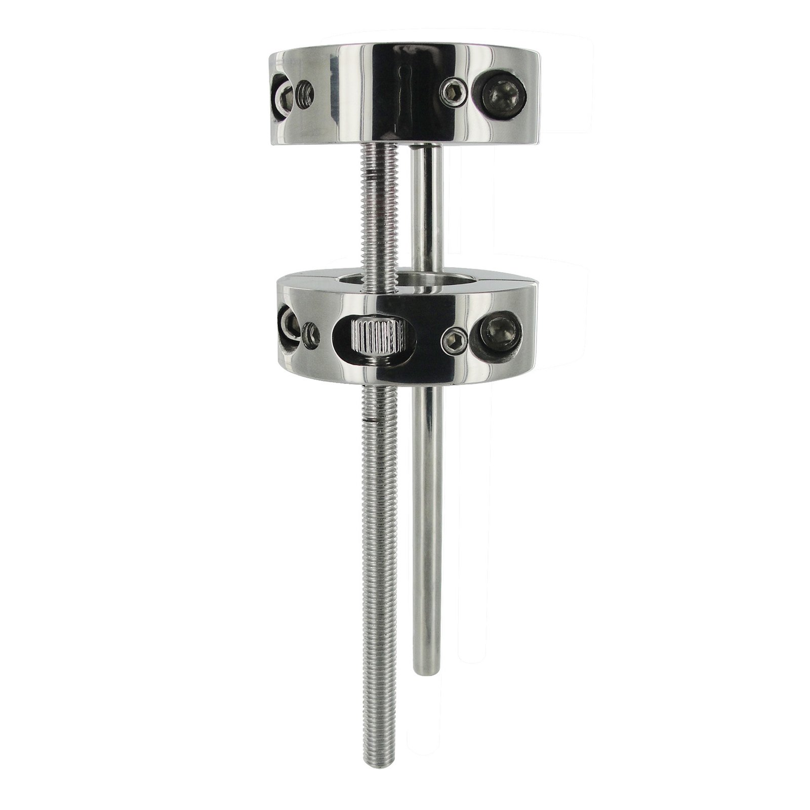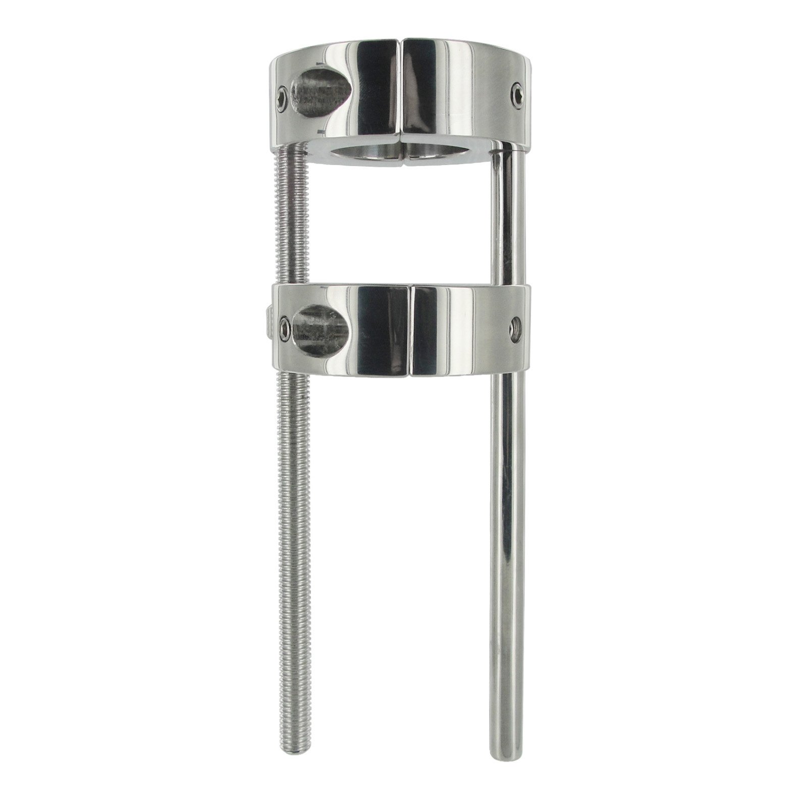 Maintain a pleasant tug on your balls or experience a tortuous extreme stretch with the fully adjustable Hells Bridge Ball Stretcher. With the two stainless steel rings side by side, place your balls through the openings and lock the rings closed with the included hex key. Now that both rings are secure around your sack, you can begin to rotate the nut on the side of the outer ring, causing the rings to draw farther apart. Take the stretch as far as you can stand it! For further torment, use the hex key to tighten down the internal screw points on each ring to introduce additional points of pressure to your stretching scenario. The Hells Bridge also doubles as a ball crusher, when you place only the inner ring around your scrotum and lower the outer ring gradually to achieve a relentless crush.