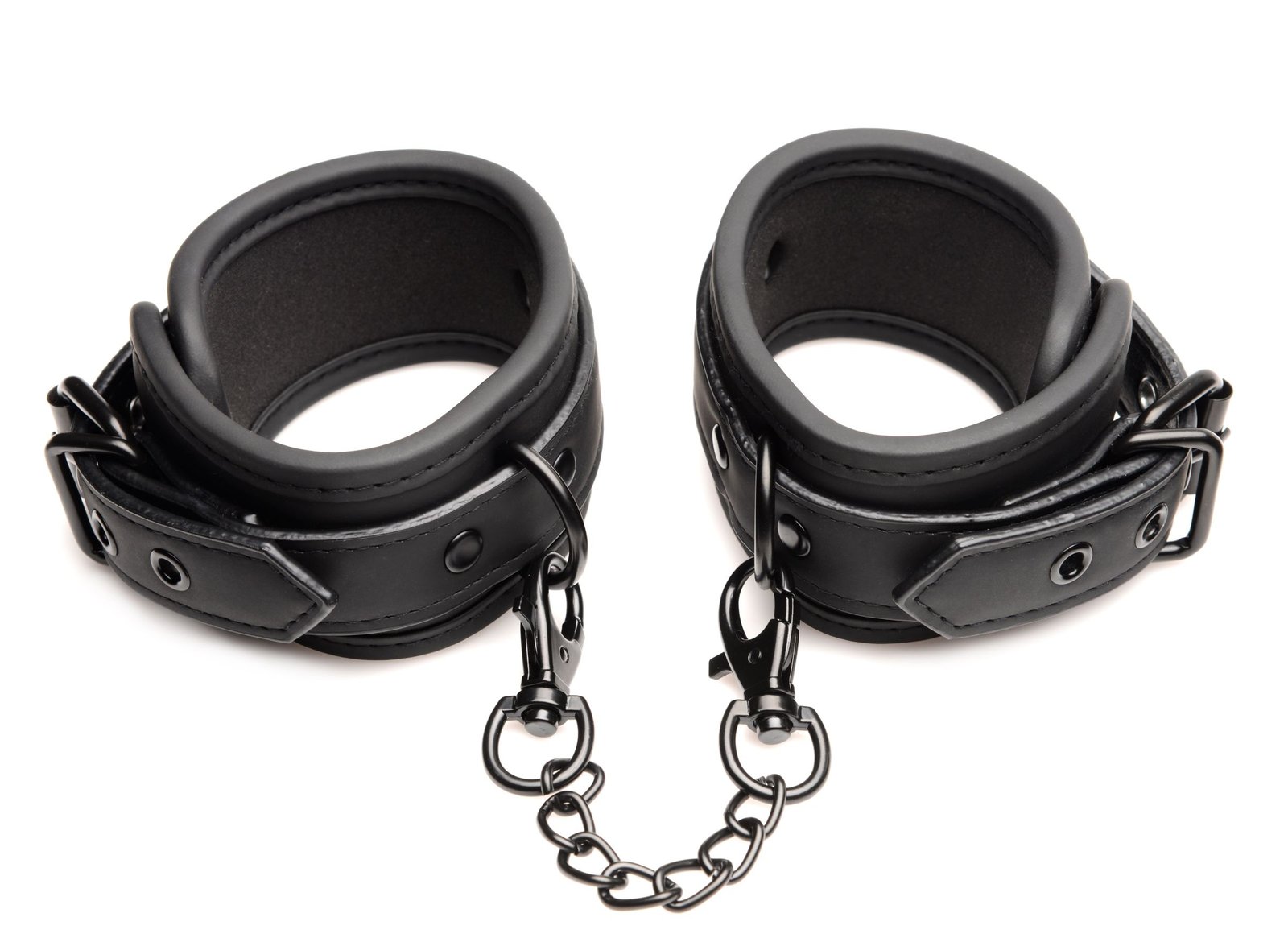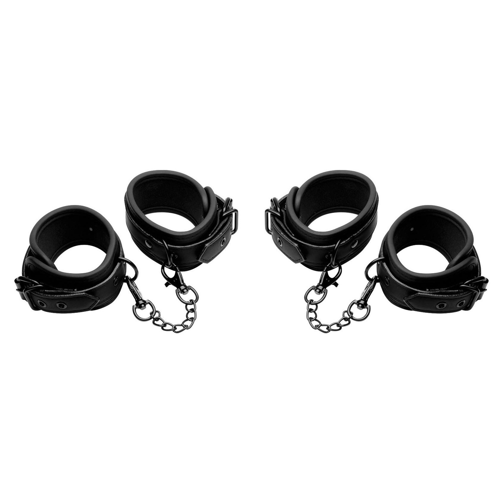 Get kinky with this Wrist and Ankle Cuff Set! The straps are fully adjustable and are padded for your comfort. Made with vegan-friendly, faux leather, the PU leather straps are comfortable and perfect for long-term wear during scenes. Each of the cuffs have a metal D-ring that the 2 metal chains attach to. All metal is nickel-free. Spot clean the set with a toy cleaner and a soft cloth.
