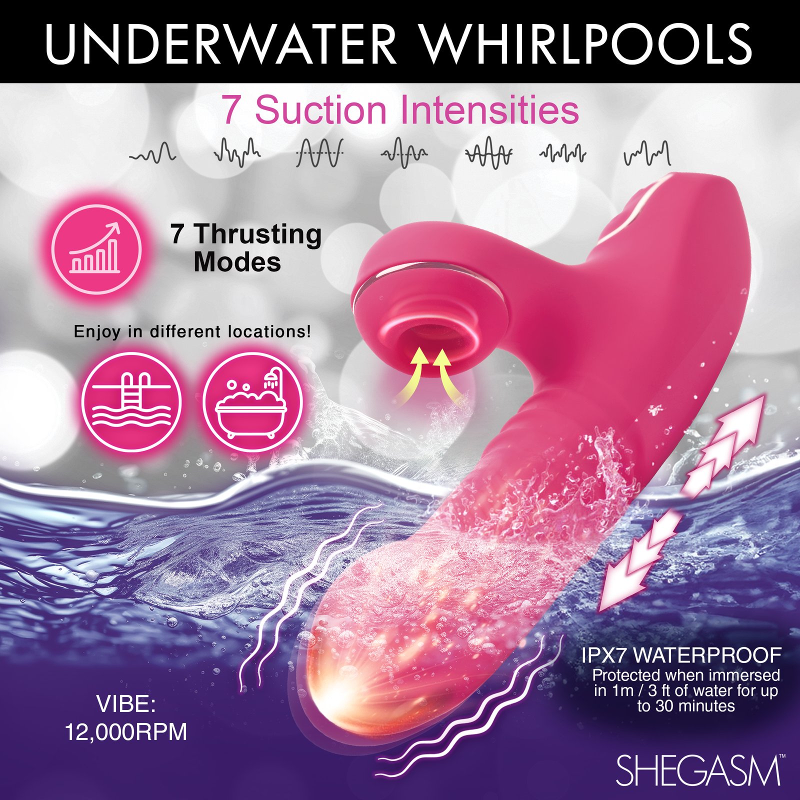 Get ready to enter a new level of bliss! The combined sensation of thrusting and suction will blow your mind. Enjoy this sleek, silky smooth, silicone rabbit toy. The textured shaft has ribs that rub you just the right way and 7 auto-thrusting modes that go deep and fill you from within! Line it up just right and you can enjoy the dual stimulation of internal and external ecstasy with a clitoral sucking rabbit arm. Enjoy 7 levels of suction that tease your precious pearl until you’ve been sucked and gently pulled into another dimension of pleasure. All materials are phthalate-free and body-safe to use with water-based lubricants. Rated IPX7, you can take this in the shower or even bring it in the bathtub and submerge it underwater for up to 30 minutes! Recharge after use via the USB cable provided. To wash, use warm water and mild soap, then rinse it off, spray it with a toy cleaner, and pat it dry.