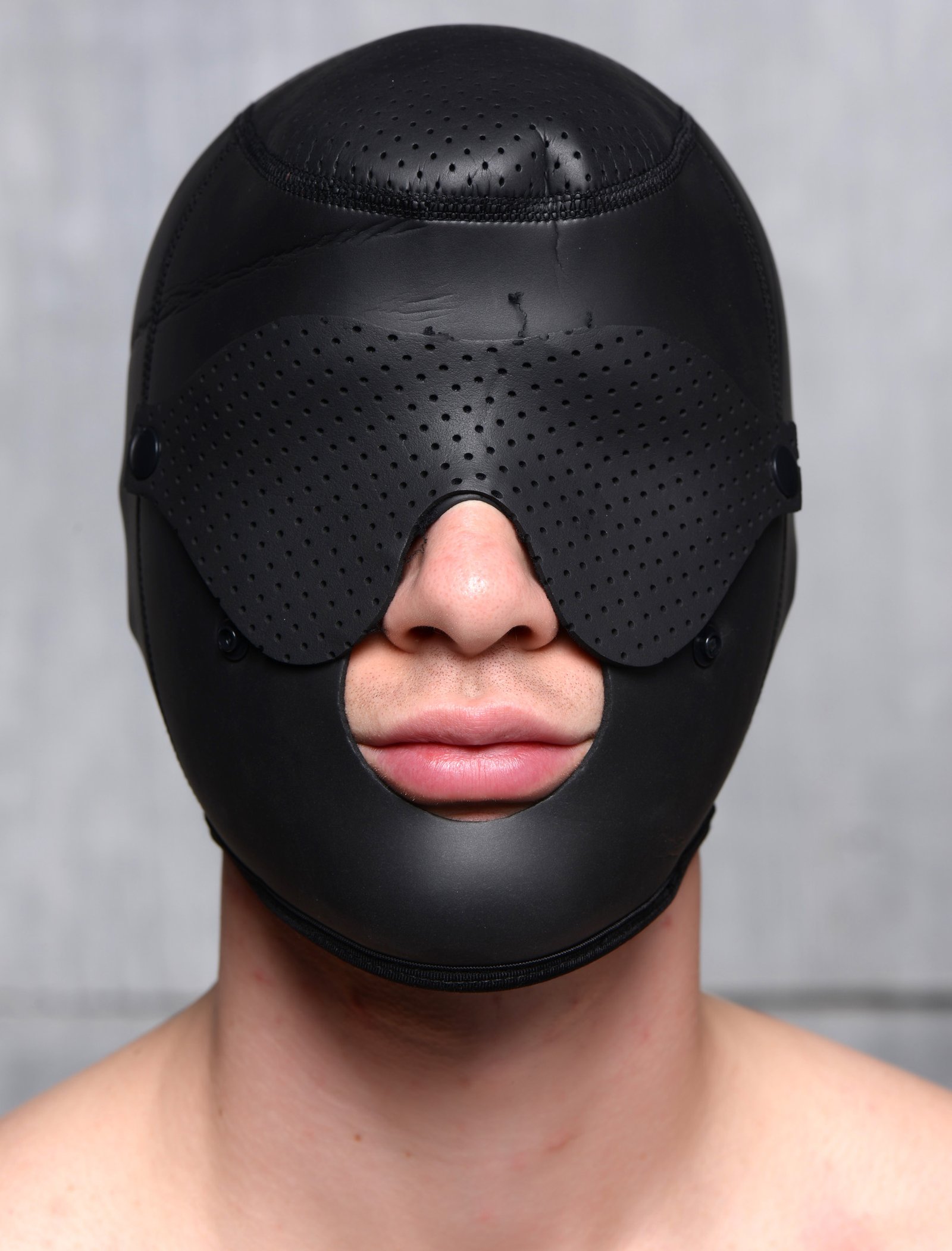 This intense hood fits over most heads and comes equipped with ventilation holes for comfortable long term wear. The customizable blindfold and mouth cover makes it easy to change the way you play with each session – keep their eyes covered and mouth free so you can enjoy every whimper and moan while you play with their vulnerable body, or muffle their voice and keep their eyes open so they can witness every tease and flog!
