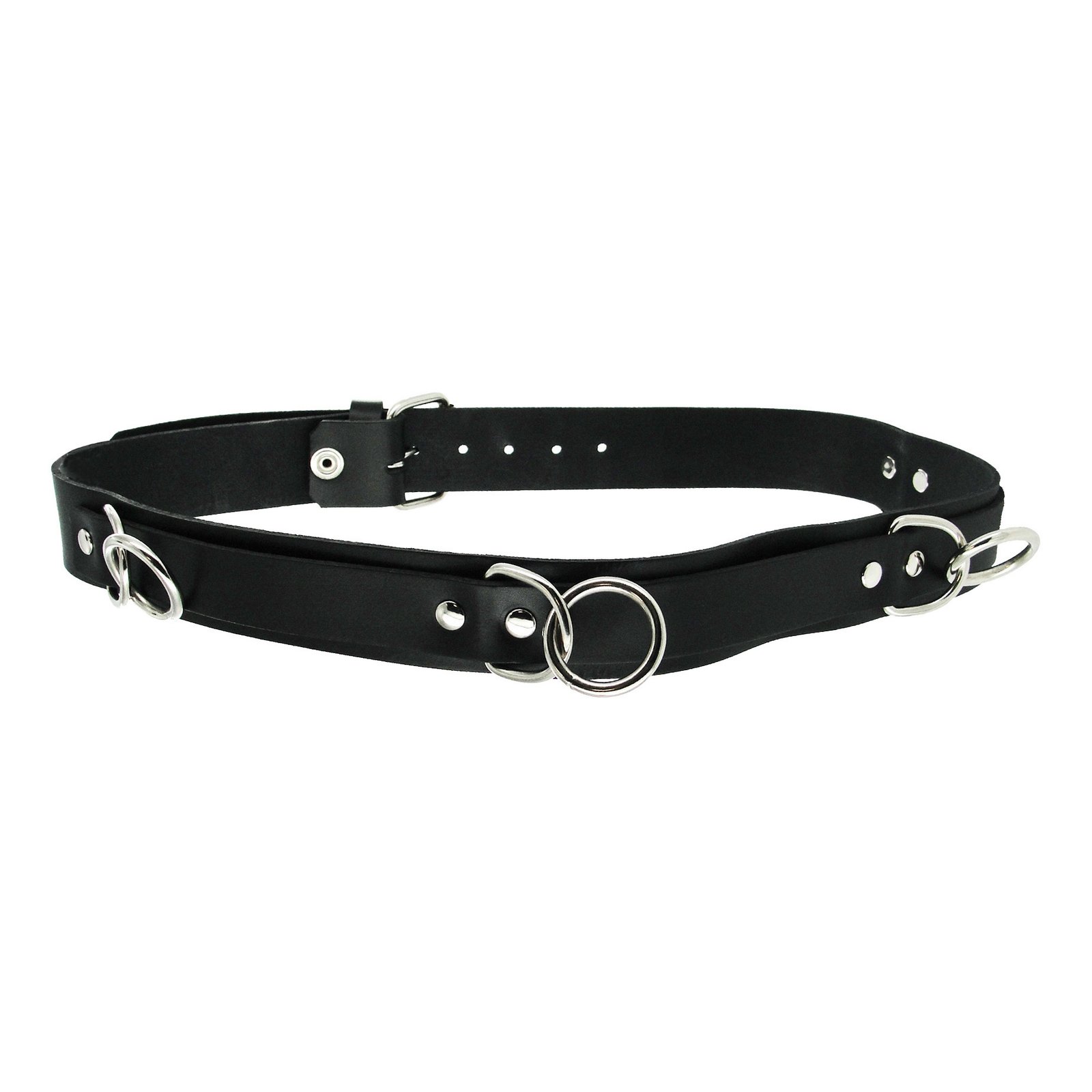 This versatile punk style bondage belt gives you endless possibilities for attaching your favorite gear and restraining your partner. Use any of the four heavy-duty D-rings to attach cuffs, rope, suspension equipment, anything you can imagine! The thick, high-quality leather looks great and is made to last, and your lover will look hot while they are all tied up!